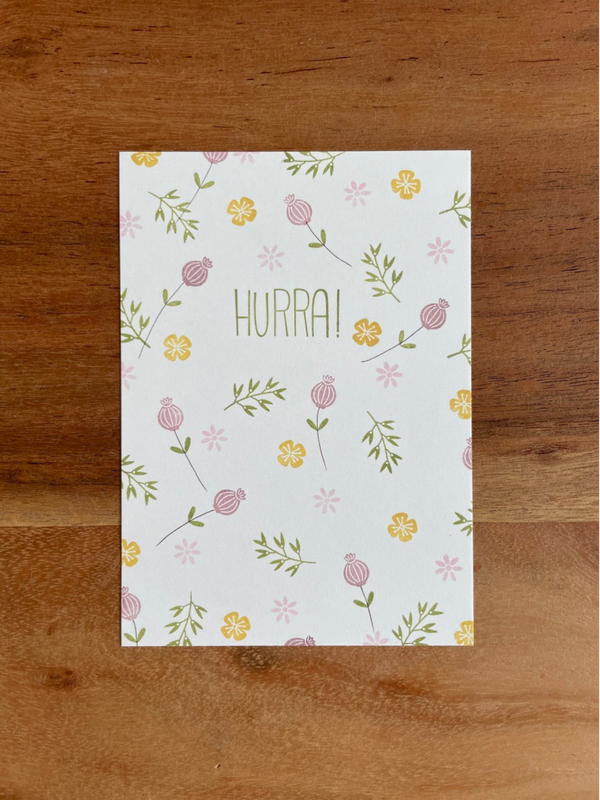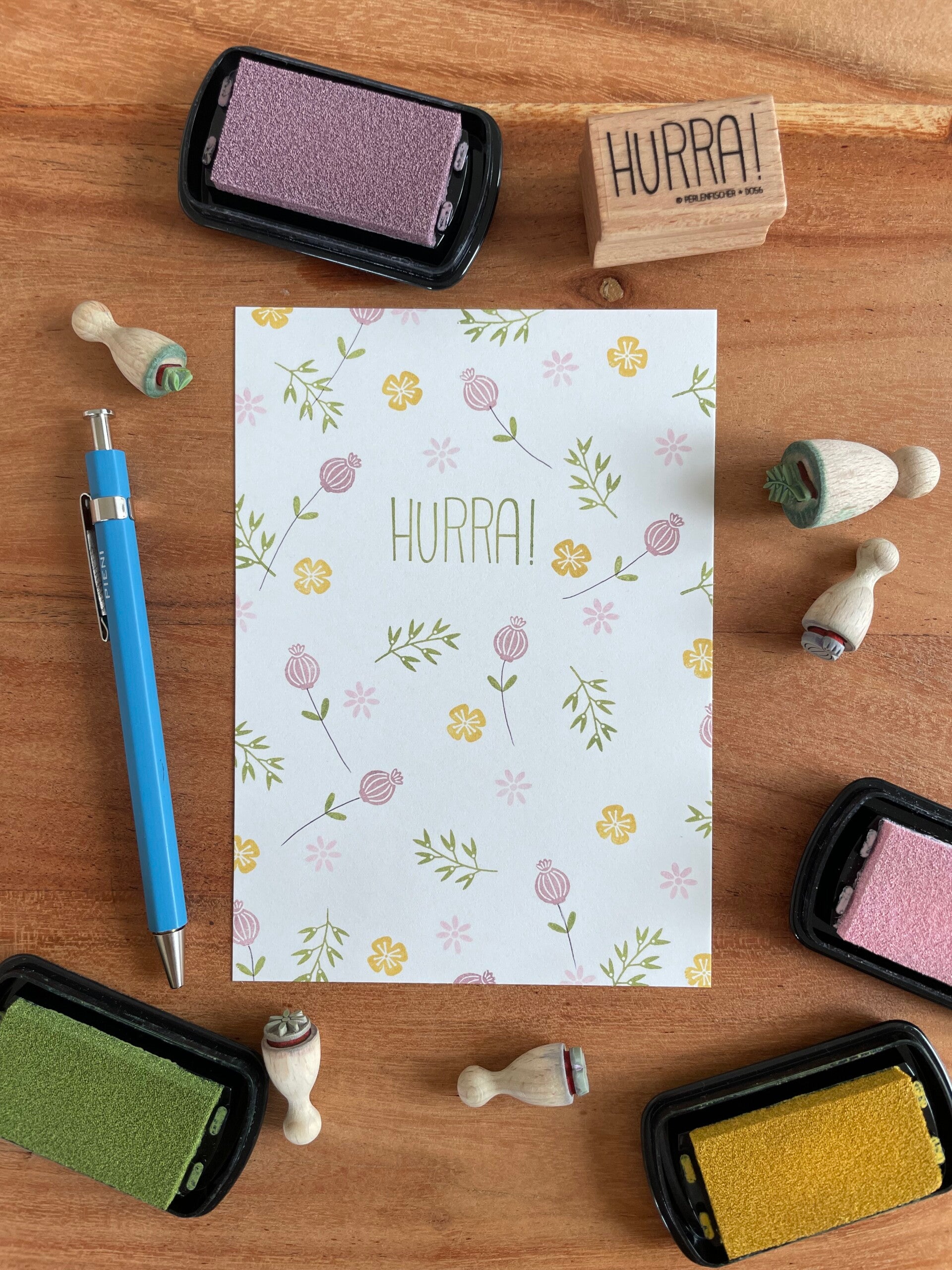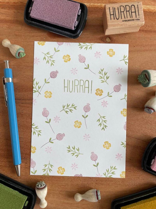 Handgestempelte Grusskarte - Blumiges Hurra!