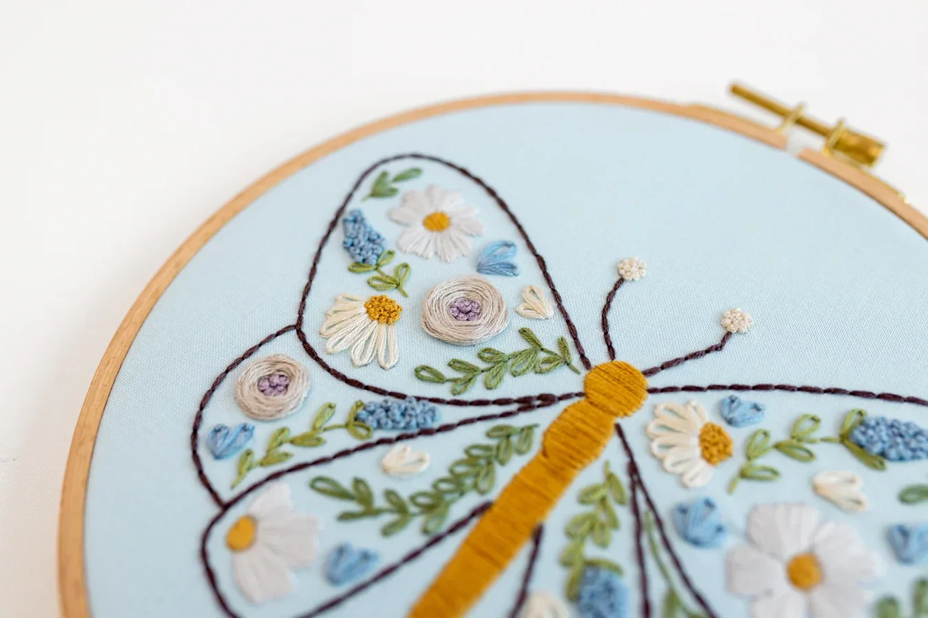 Mit diesem Stickset gestaltest du einen blühenden Schmetterling. Du lernst Schritt für Schritt grundlegende Techniken und lässt dabei zarte Blumenmotive entstehen. Es eignet sich auch perfekt für Anfänger. Geniesse eine kreative Auszeiten.