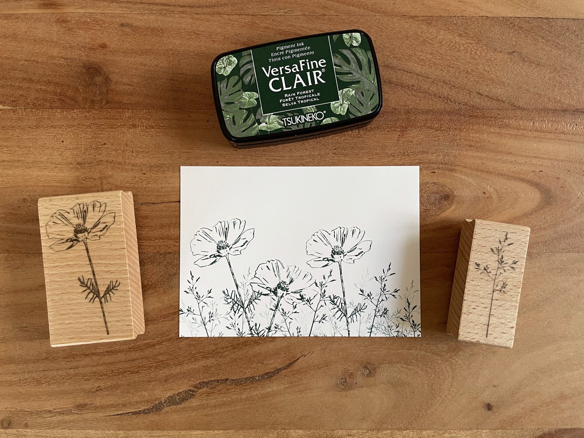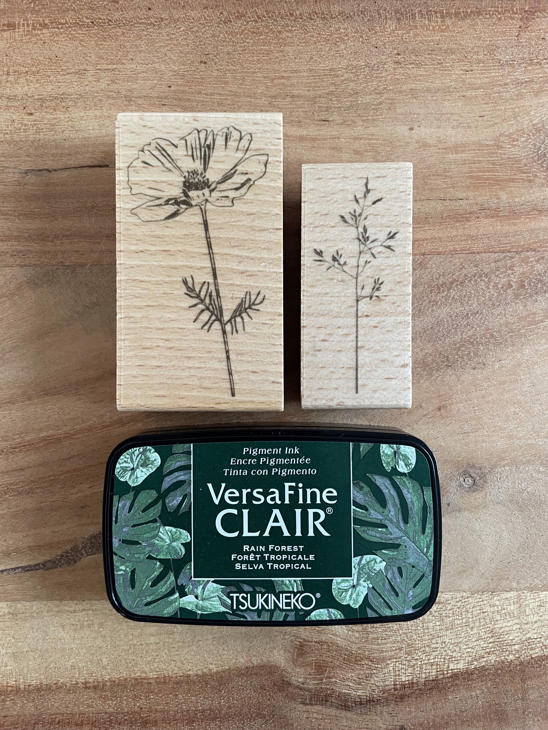 Zum Set gehören außerdem fünf cremefarbene Karten von Perlenfischer, ideal für Grüße, kleine Kunstwerke oder kreative Projekte. Optional kannst du das Stempelset mit dem hochwertigen VersaFine Clair Stempelkissen in der Farbe „Rain Forest“ bestellen – perfekt abgestimmt auf die Pflanzenmotive.