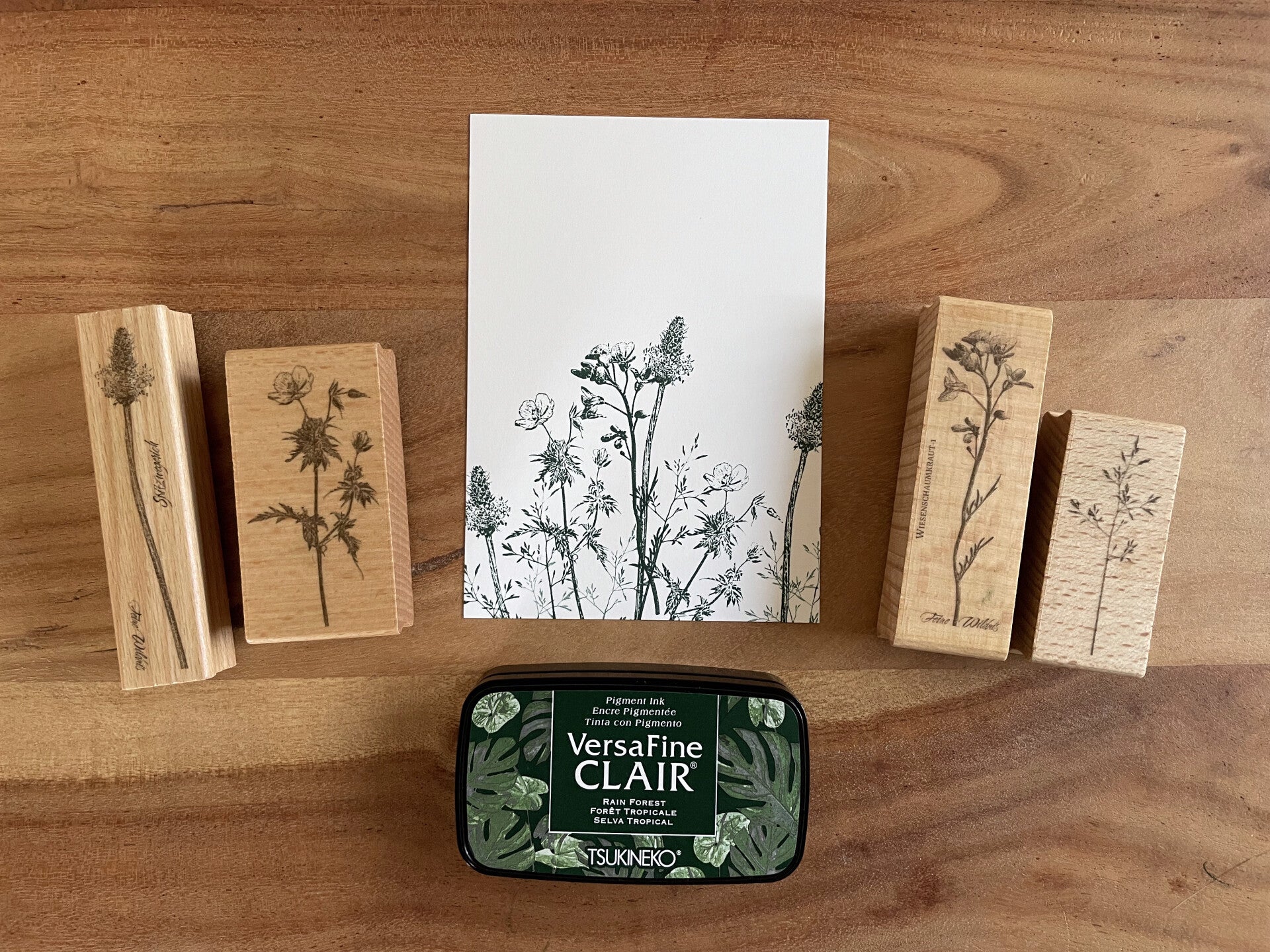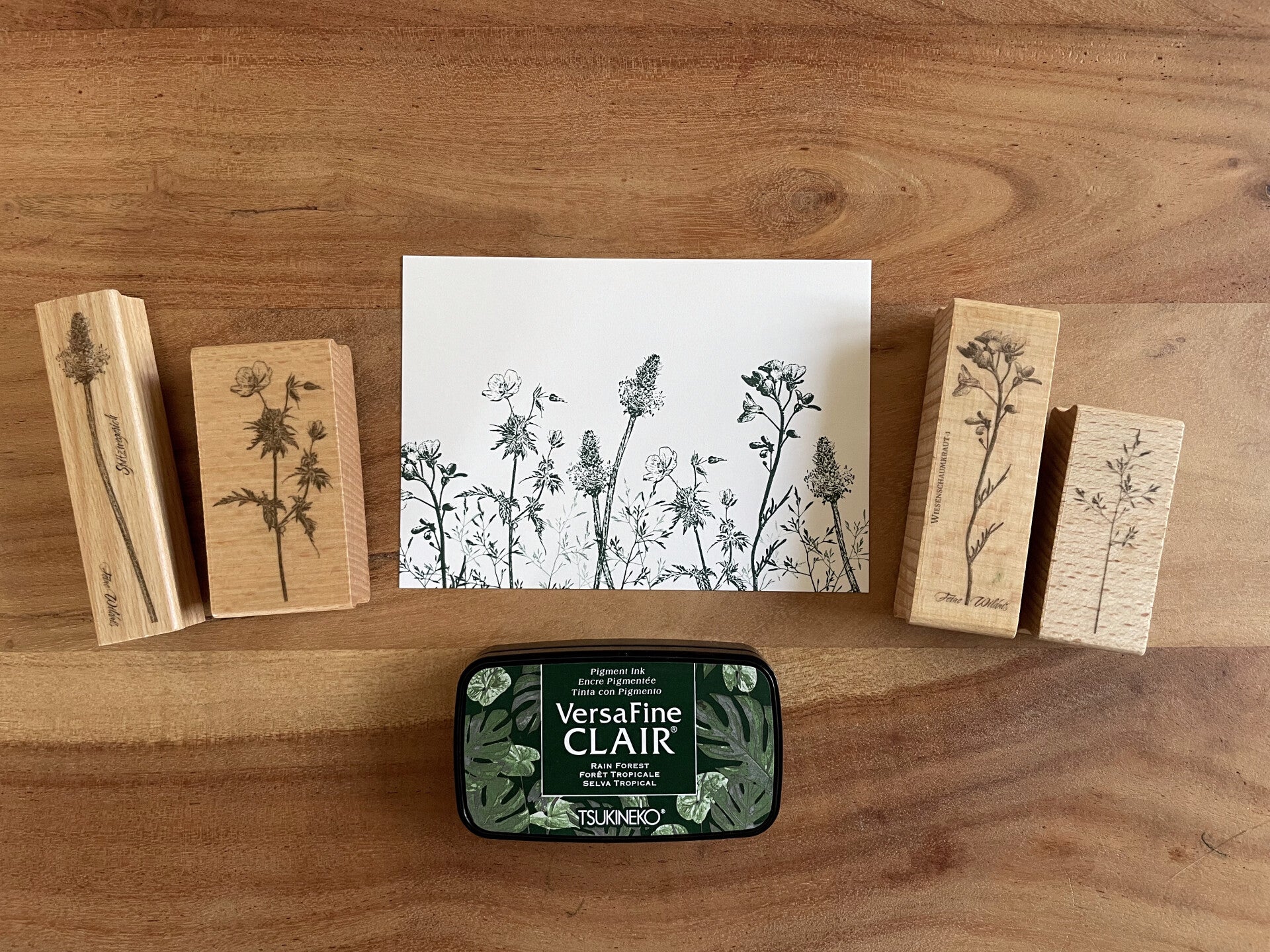 Zum Set gehören außerdem fünf cremefarbene Karten von Perlenfischer, ideal für Grüße, kleine Kunstwerke oder kreative Projekte. Optional kannst du das Stempelset mit dem hochwertigen VersaFine Clair Stempelkissen in der Farbe „Rain Forest“ bestellen – perfekt abgestimmt auf die Pflanzenmotive.