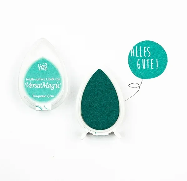 VersaMagic Stempelkissen der japanischen Firma Tsukineko. Sie ist eine deckende Tinte auf Wasserbasis, die je nach Material innerhalb von 10 bis 15 Minuten trocknet. Die Tinte ist wasserfest, sodass Sie problemlos Schicht auf Schicht arbeiten können. Zudem ist die Tinte lichtbeständig und behält ihre ursprüngliche Farbe auch bei längerer Sonneneinstrahlung.
