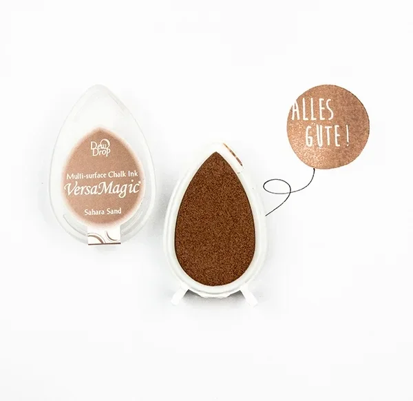 VersaMagic Stempelkissen der japanischen Firma Tsukineko. Sie ist eine deckende Tinte auf Wasserbasis, die je nach Material innerhalb von 10 bis 15 Minuten trocknet. Die Tinte ist wasserfest, sodass Sie problemlos Schicht auf Schicht arbeiten können. Zudem ist die Tinte lichtbeständig und behält ihre ursprüngliche Farbe auch bei längerer Sonneneinstrahlung.